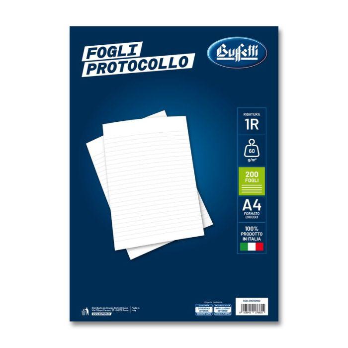 Carta protocollo realizzata con pura cellulosa. Viene fornita in formato chiuso A4 da 60g/mq (il modello uso bollo è proposto anche in carta da 120g/mq). Disponibile in confezioni da 20 e da 200 fogli (l'uso bollo da 120g/mq è in confezione da 100 fogli). Formato aperto: A3 (29,7 x 42 cm).